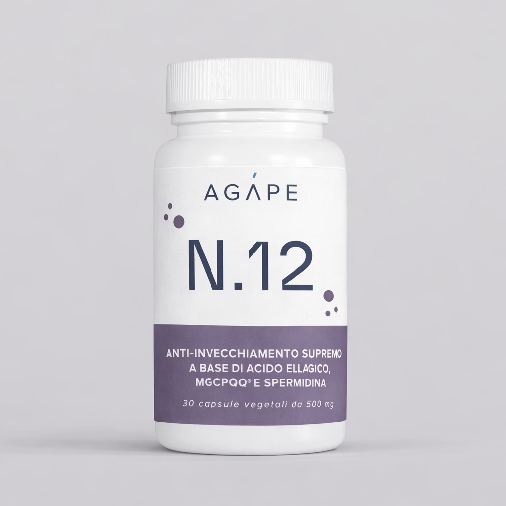 AGAPE N.12 è una formulazione di pregio pensata per chi desidera scegliere un’integrazione moderna, essenziale e qualitativamente molto elevata. Il prodotto unisce tre attivi di particolare interesse nutraceutico: Spermidina, MGCPQQ® e Melograno standardizzato in acido ellagico. La logica della formula è quella di lavorare con pochi ingredienti, ma di grande valore, accuratamente selezionati e dosati in modo razionale.